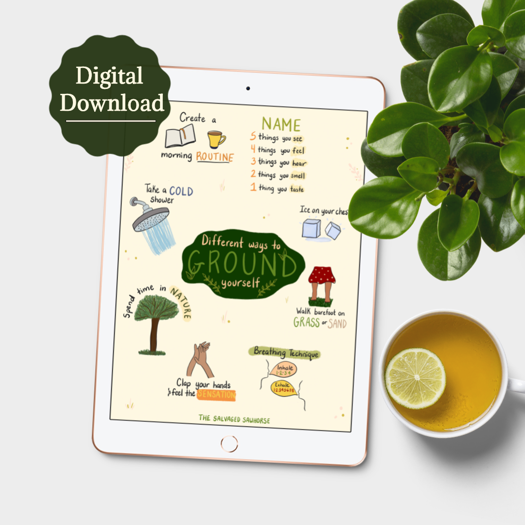 Grounding: Strategies to help you reconnect with the present moment when you're feeling anxious, stress or overwhelm. I illustrated different ways to self-regulate when you feel your body going into a fight- flight- freeze response.